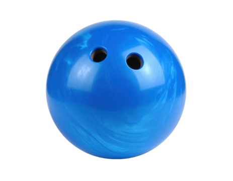 A shiny blue bowling ball featuring two finger holes, showcasing a marbled texture with a vibrant finish.