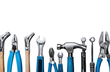 Hand tools and workshop equipment on transparent background frame