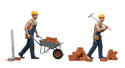 Construction Worker Stages: Muscular Man in Blue Overalls and Yellow Hard Hat Moving Bricks with Wheelbarrow, Hammer, and Building a Wall against