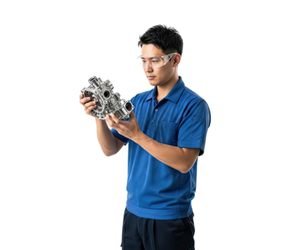 Smiling repairman in blue overalls, hands on hips with transparent background