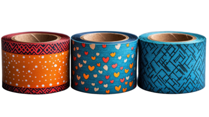Three rolls of patterned tape sitting next to each other closely on transparent background