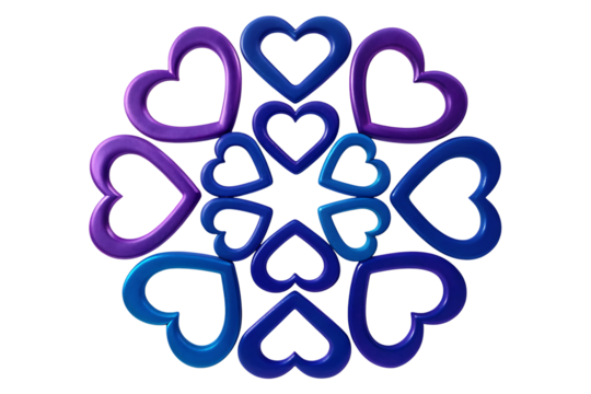 Purple and blue hearts arranged in circular pattern on white not present isolated on a transparent background