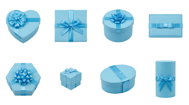 Blue gift box set including heart, square, round, hexagon, and cylindrical shapes with satin ribbons. Luxury present and celebration packaging collection.