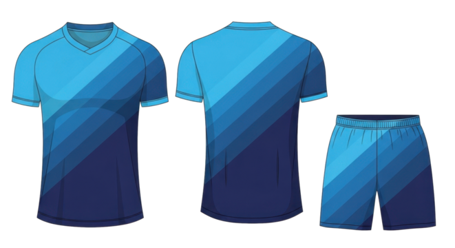 A blue and navy gradient patterned athletic jersey and shorts set, presented from front, back, and side views, showcasing sportswear design.