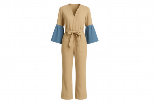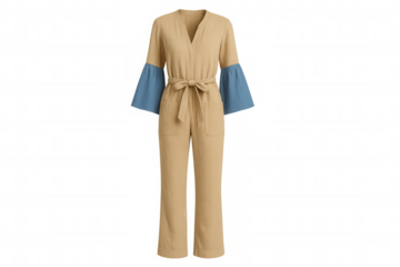 Studio shot featuring a stylish beige jumpsuit with elegant blue sleeves and a coordinating belt, isolated on a transparent background