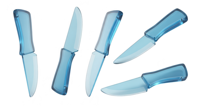Rendered 3D set of transparent blue knives on a white background showcasing angles for culinary food kitchen cooking applications