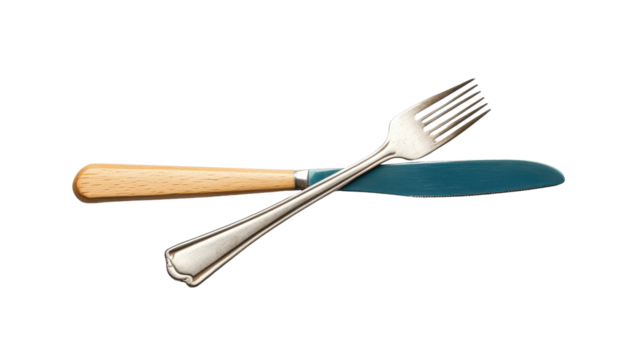 Isolated silver dining fork crossed with a knife featuring a wooden handle and blue blade, provided as a PNG asset on a transparent background