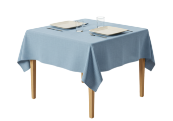 Isolated table with blue tablecloth, dishes, silverware, and glasses in the dining room