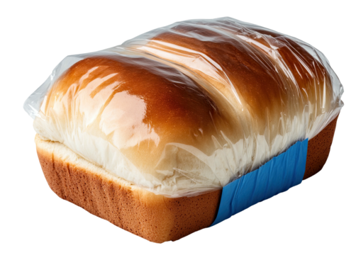 Wrapped loaf of shiny, golden-crusted bread; tight plastic seal, blue label