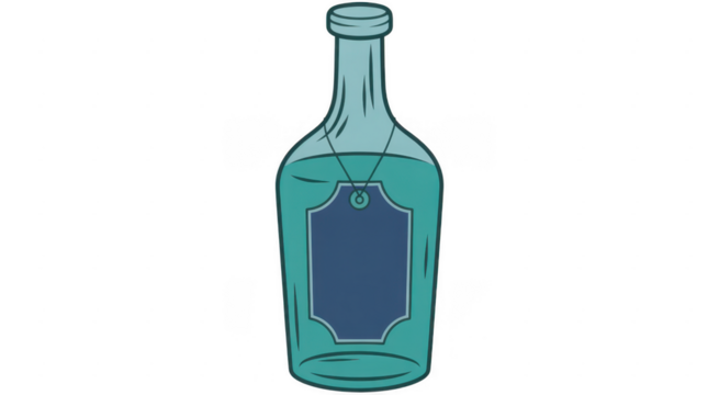 Green champagne bottle with blue label, gold foil, brown cork popping, effervescent liquid splashing on transparent isolated background, celebration and triumph concept