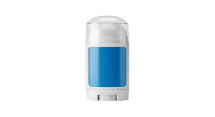 White solid deodorant stick, with blue label and clear cap, isolated on a transparent background, cutout, PNG