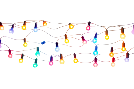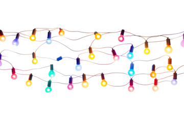 String of Christmas lights with multicolored bulbs and transparent background for your Holiday Season designs and other projects