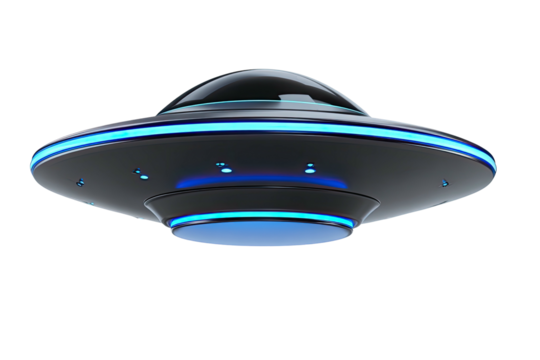 Sleek, futuristic black flying saucer with glowing blue lights on transparent background
