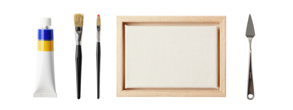 Photograph of painting supplies, includes wooden frame, paintbrush, black pen, white tube of paint with blue and yellow bands, and metal palette knife, arranged in a straight line.