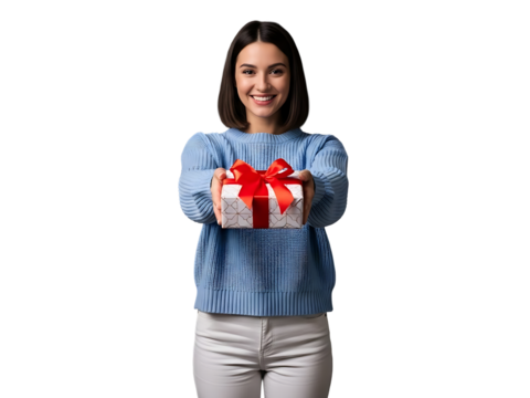 A young woman with a radiant smile and shoulder-length dark brown hair offers a beautifully wrapped gift against a black background. Dressed in a soft light blue sweater and white pants, she holds a w