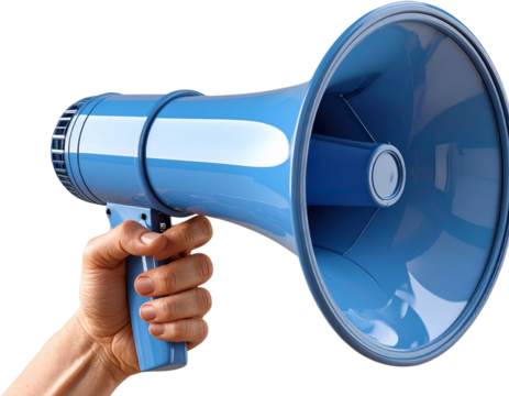 Hand holding a blue megaphone isolated on transparent background