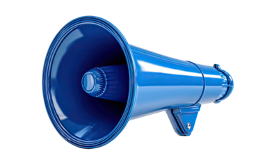 A vibrant blue megaphone, angled, isolated