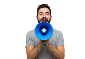 A man with a beard happily announces something through a blue megaphone isolated on transparent background