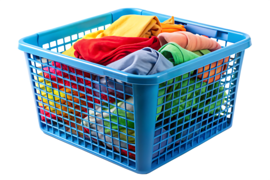 Colorful cloths in a blue mesh plastic basket isolated transparent backgroun.PNG