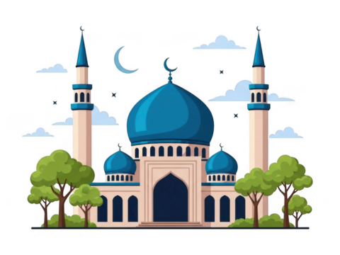 Illustrated mosque with crescent moon isolated on transparent background