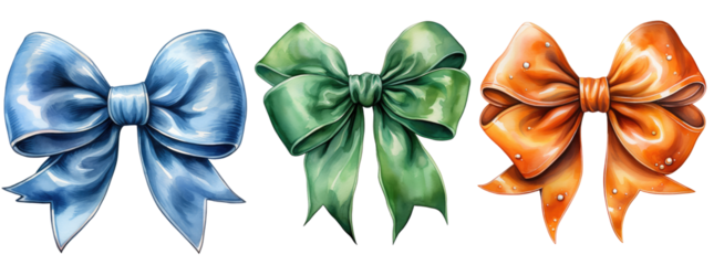 Blue, orange and green bow isolated on transparent background, set of different colored bows in png