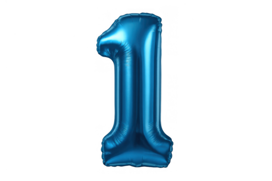 Blue number 1 foil balloon celebrating a first birthday, anniversary, or achievement on a transparent background