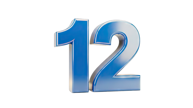 3D Blue Number 12 with Metallic Silver Edges on transparent background