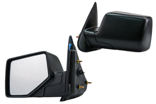 Close-up of a Blank Ford car door mirror on a White Background. Front view and back view bundle. Industrial design reference