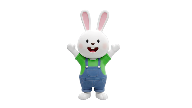 Joyful cartoon bunny in denim overalls and green t-shirt with arms raised