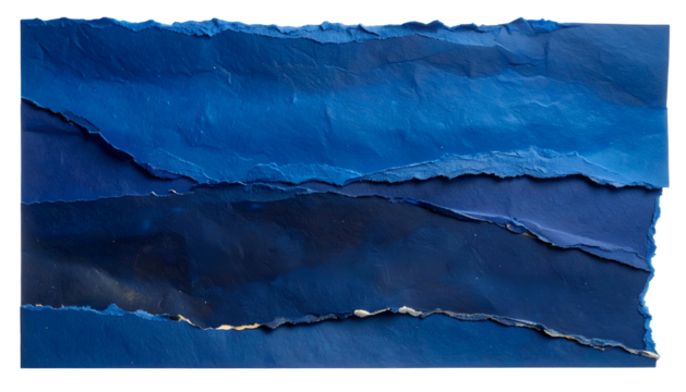 Abstract art piece with torn, layered blue paper sections, varied hues