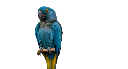 Vibrant blue parrot isolated on white background perched gracefully showcasing its feathers against a plain backdrop