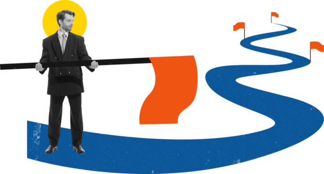Collage of businessman planting red flag on winding road with blue path on transparent background. Concept of personal goal setting, leadership motivation, business coaching, and career milestone.