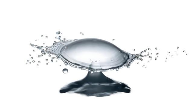 Pristine water droplets splashing, glistening with pure transparency, embodying crisp hydration and serene clarity