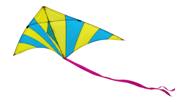 Isolated Kite with Bright Yellow and Blue Pattern and Streamers Ready to Fly Outdoors