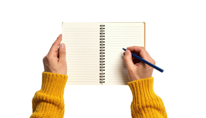 Person in yellow sweater writing with a blue pen in an open, spiral-bound notebook