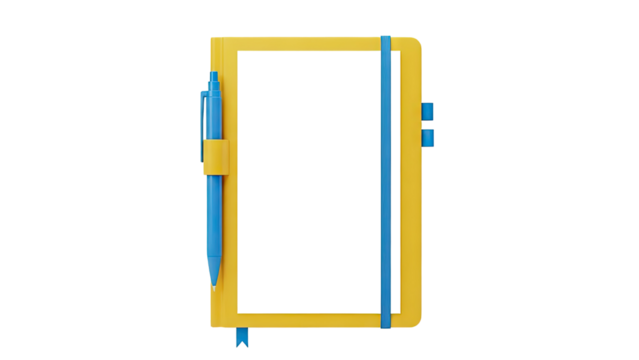 3D Yellow notebook with blue pen and elastic band on transparent background