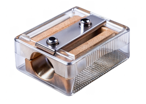 Top view, red pencil sharpener, a tool for sharpening pencils and an essential tool for document work, writing or drawing, isolated on transparent background.