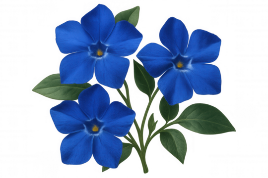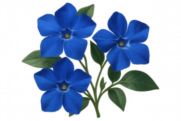 Periwinkle flowers displaying rich blue petals and verdant leaves, standing against transparent backdrop for clean, versatile graphic design use