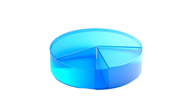 3D rendered pie chart graphic, transparent and glowing blue against a black background