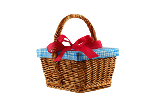 Wicker Picnic Basket with Blue Plaid Lid and Red Ribbon Bow, isolated on white transparent background