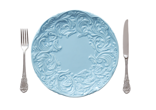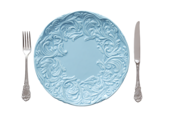 Ornate blue plate with silverware isolated on transparent background for elegant dining isolated on a transparent background