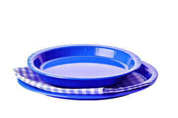 A Stack of Blue Plates With a Checkered Napkin on a White or Clear Surface PNG Transparent Background