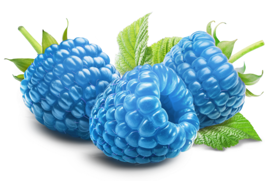Three juicy cool blue raspberries with leaf isolated on a transparent background.