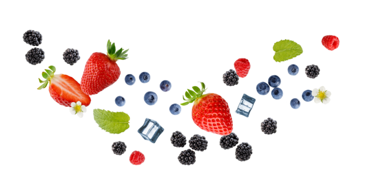 Fresh ripe strawberry, raspberry, blueberry and blackberry berries, mint leaves and ice cubes flying falling isolated on white background.
