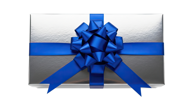 A silver gift box with a blue ribbon and bow on a png transparent