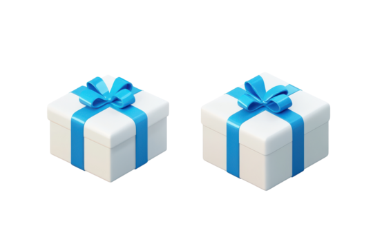 Two white gift boxes with blue ribbons isolated on transparent background. Two white gift box with blue ribbon icon isolated on white background, 3d rendering.