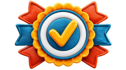 Colorful 3D award seal with check mark icon and blue ribbons