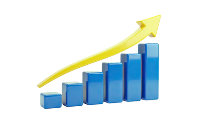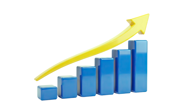A blue bar graph with an upward trend arrow on a transparent background showing growth