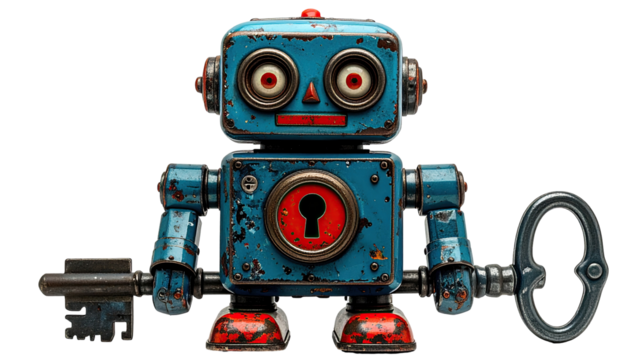 Robotic arm completes puzzle with blue orange piece, transparent background