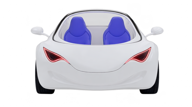 Sleek white convertible car with futuristic design features blue seats and distinctive red headlights, exuding modern and innovative aesthetic